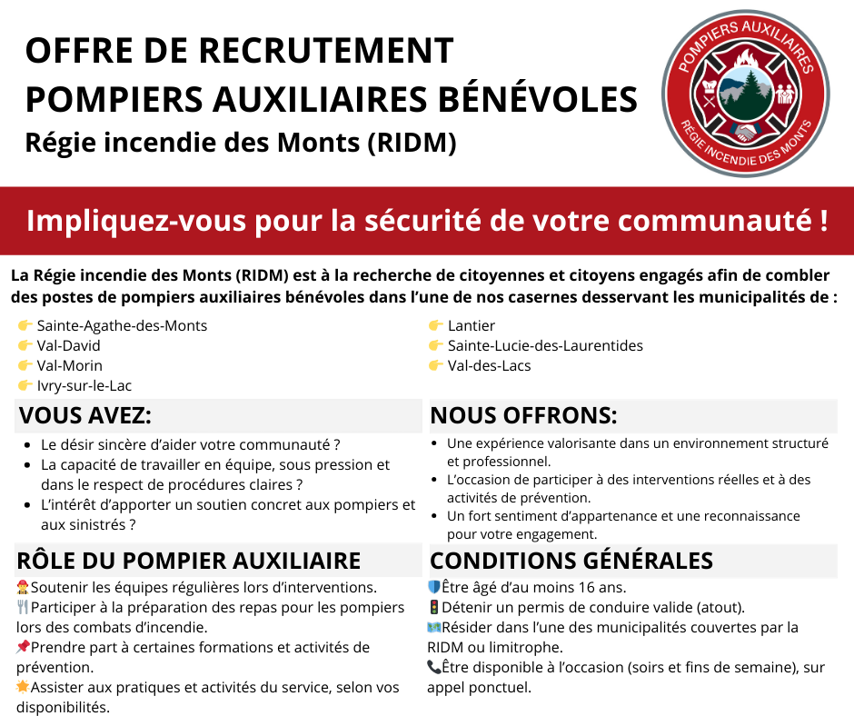 La Régie incendie des Monts (RIDM) recherche des personnes engagées pour rejoindre son équipe et contribuer à la sécurité de nos communautés.